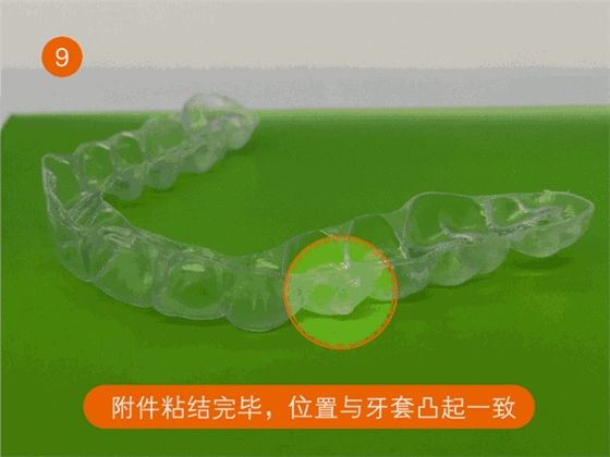 拿起牙套可以看到牙套内附件的位置是透明凸起的,与附件位置吻合,戴上牙套。